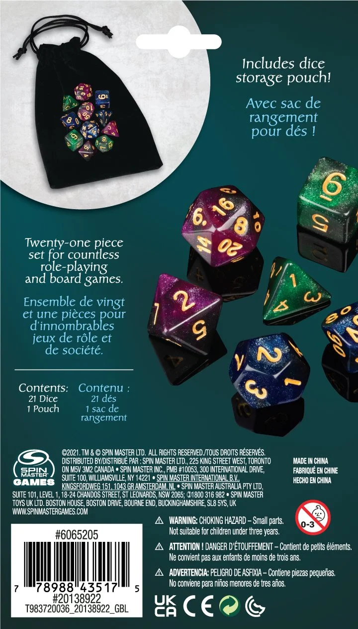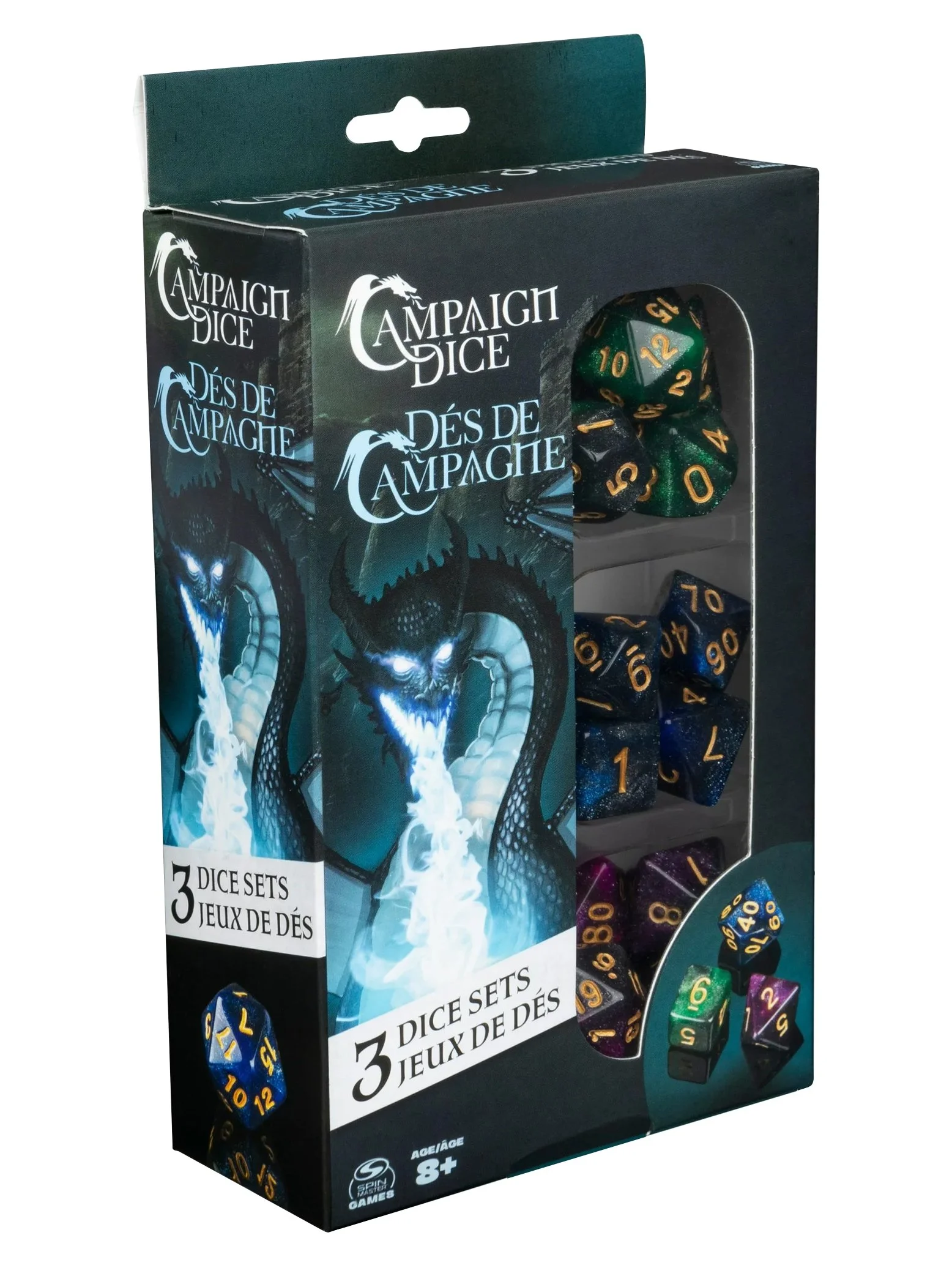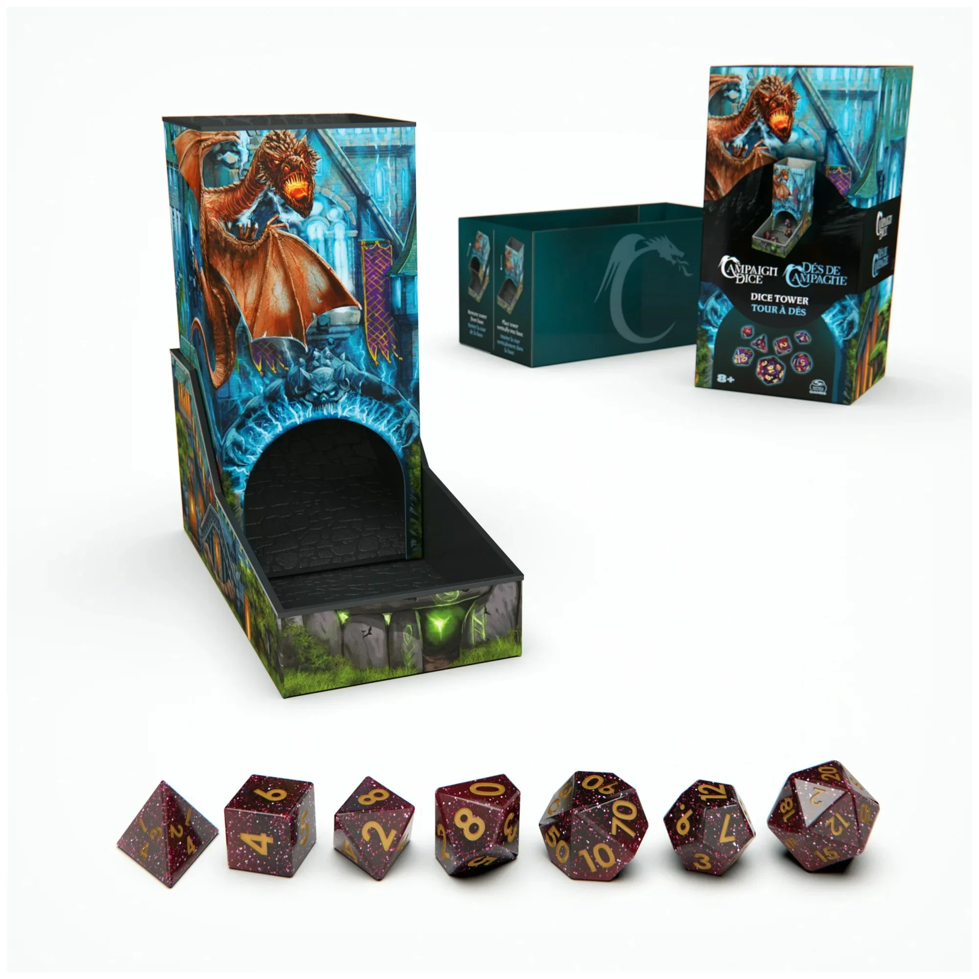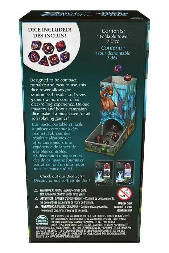 spin master games offers dice sets and a campaign dice tower for role-playing tabletop games. the goal while designing packaging for both items was to maintain a consistent brand look but also make sure each item stands well on it’s own. the focus of the dice sets was to showcase the beautiful dice as much as possible. the dice tower packaging utilizes the artwork from the tower itself to create a faux belly band look.